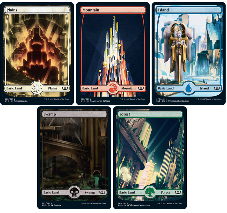 MTG’s take on urban fantasy, Streets of New Capenna, includes 10 full art “Metropolis” basic lands.